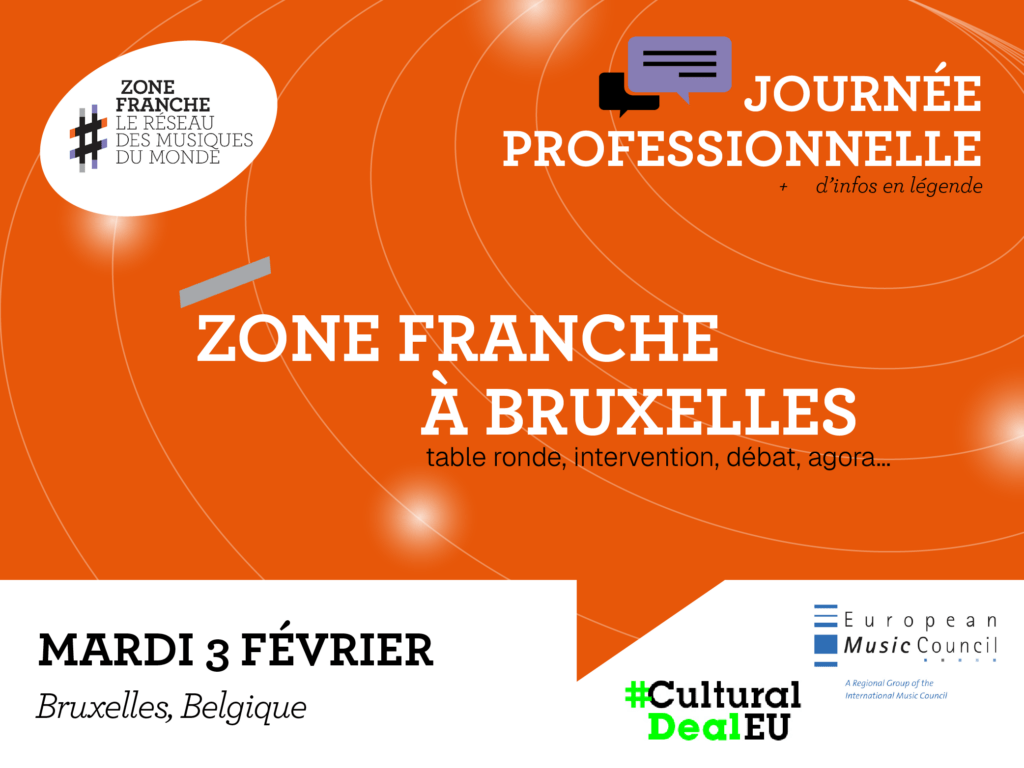 Le matin même, l’Euro­pean Music Coun­cil, dont Zone Franche est un tout jeune mem­bre, en prof­ite pour tenir une table ronde réservée à ses mem­bres sur la “bous­sole cul­turelle de l’Eu­rope”, con­cer­nant le nou­veau pro­gramme cul­turel européen émis par la Com­mis­sion Européenne.